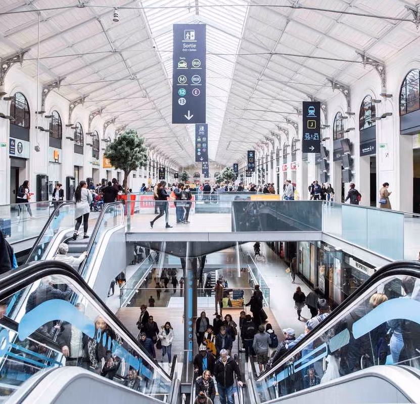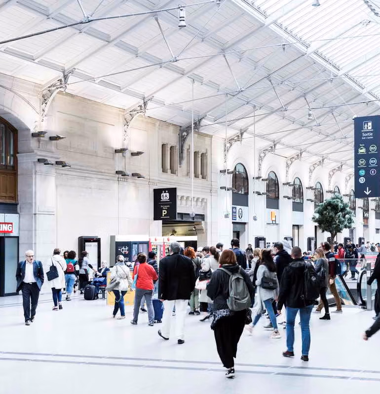 Tous les jours, 1,2 million de personnes transitent par la gare Saint-Lazare. C’est le deuxième pôle de convergence européen en termes de trafic, tous moyens de transport confondus : trains, bus, métro et RER. Elle plonge directement les voyageurs au cœur de Paris, à deux pas de l’Opéra, de la Madeleine, des Grands Boulevards… Inondé de lumière par sa nouvelle verrière, son centre a été conçu pour des visiteurs ultra-mobiles, désireux d’optimiser leur temps. Il s’organise autour de liaisons verticales constituées de 20 escaliers mécaniques et ascenseurs. De chacun de ses trois niveaux, il offre une vision d’ensemble de la gare. En près de 80 boutiques, le lieu déploie une offre commerciale parfaitement ciblée avec des enseignes de proximité, des concepts connus et une nouvelle génération de marques très dynamiques. Sans compter ses 10 espaces de restauration, kiosques et services. Ici commence le voyage…