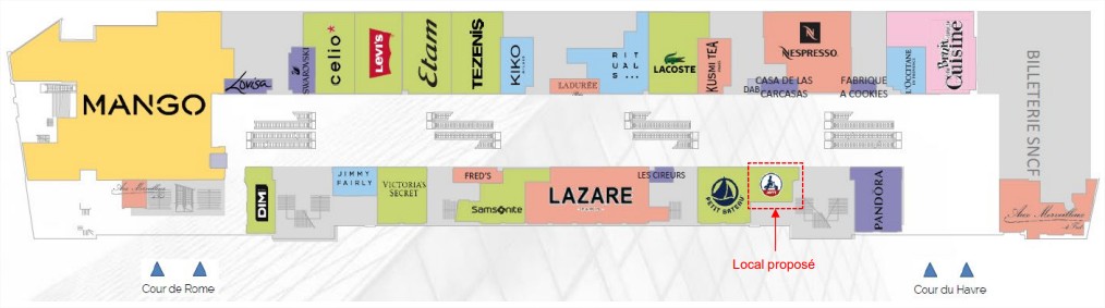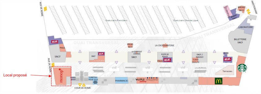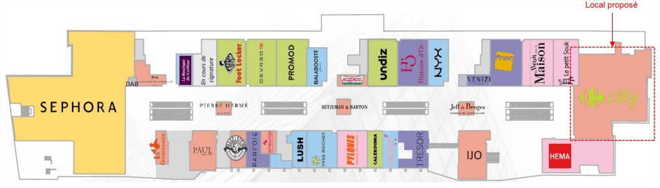 Activité autorisée sur l’emplacement : Alimentaire / Equipement de la personne / Equipement de la maison / Beauté Santé (dans un strict respect du CPTA) Durée du contrat : 6 ans à compter de la prise d’effet du contrat de sous-occupation Date de mise à disposition prévisionnelle de l’emplacement : 19/07/2027 (sous condition de libération du local par l’enseigne en place)
